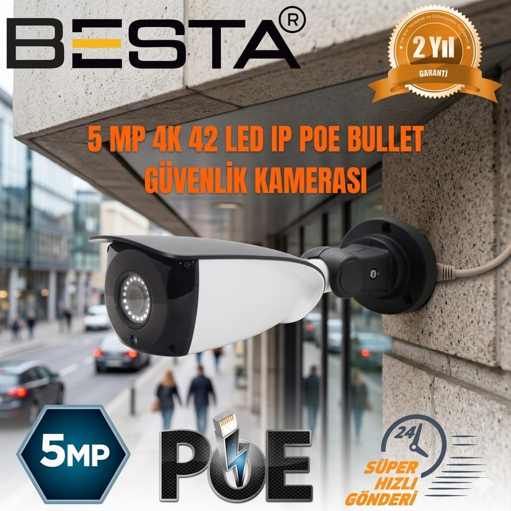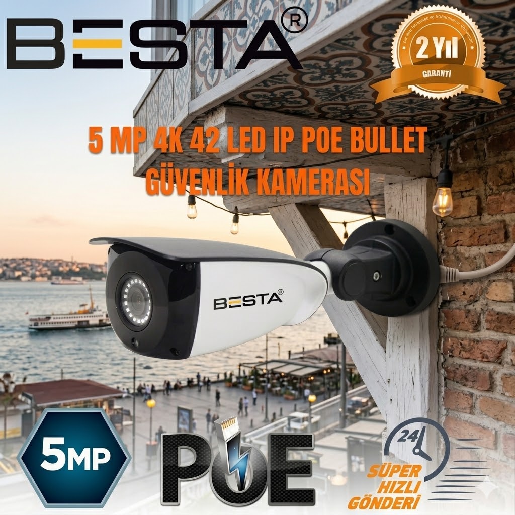 BESTA IP POE BT-1436 5 MP 42 LED Güvenlik Kamerası yüksek çözünürlük güçlü gece görüş performansı ve ses desteği ile profesyonel güvenlik ihtiyaçları için geliştirilmiş bir kamera modelidir. Ev iş yeri depo fabrika ve açık alanlarda kesintisiz güvenlik sağlamak için ideal bir çözümdür. Günün her saatinde net görüntü sunarak güvenlik seviyesini üst noktaya taşır.