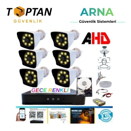 6 ADET - WARM LED IŞIKLI GECE RENKLİ 5MP LENS 2 MP 1080P AHD DIŞ MEKAN WATERPROOF GÜVENLİK KAMERASI